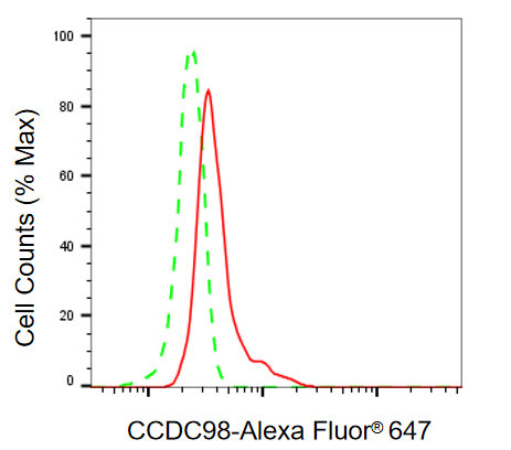 Flow cytometric analysis of CCDC98 expression in HT-1080 cells using CCDC98 antibody. Green, isotype control; red, CCDC98.