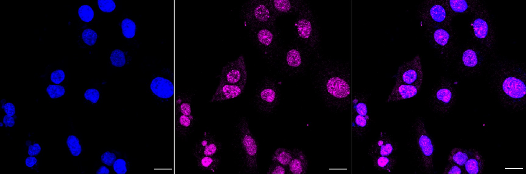 Immunocytochemical staining of HT-1080 cells with CCDC98 antibody. Nuclei were stained blue with DAPI; CCDC98 was stained magenta with Alexa Fluor? 647. Images were taken using Leica stellaris 5. Protein abundance based on laser Intensity and smart gain: Medium. Scale bar, 20 μm.