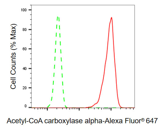 Flow cytometric analysis of acetyl-CoA carboxylase alpha expression in HepG2 cells using acetyl-CoA carboxylase alpha antibody. Green, isotype control; red, acetyl-CoA carboxylase alpha.