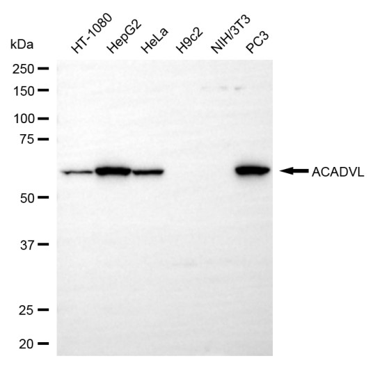 Western blotting analysis using ACADVL antibody. Total cell lysates (30 μg) from various cell lines were loaded and separated by SDS-PAGE. The blot was incubated with ACADVL antibody and HRP-conjugated goat anti-rabbit secondary antibody respectively.
