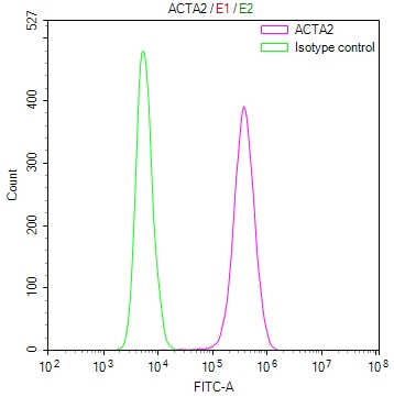 • Overlay Peak curve showing HepG2 cells stained with CSB-RA163563A0HU (red line) at 1:100. The cells were fixed in 4% formaldehyde and permeated by 0.2% TritonX-100 for 10min. Then 10% normal goat serum to block non-specific protein-protein interactions followed by the antibody (1ug/1*106cells) for 45min at 4℃. The secondary antibody used was FITC-conjugated goat anti-rabbit IgG (H+L) at 1/200 dilution for 35min at 4℃.Control antibody (green line) was Rabbit IgG (1ug/1*106cells) used under the same conditions. Acquisition of >10,000 events was performed.