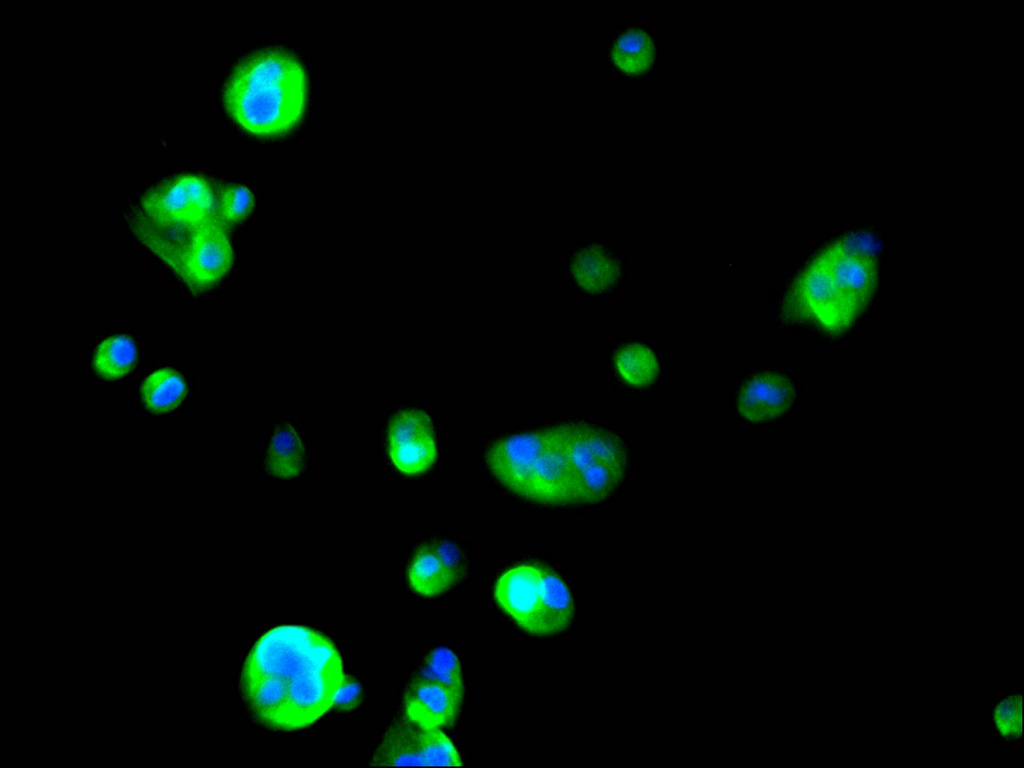 • Immunofluorescence staining of HepG2 cell with CSB-RA163563A0HU at 1:50, counter-stained with DAPI. The cells were fixed in 4% formaldehyde, permeabilized using 0.2% Triton X-100 and blocked in 10% normal Goat Serum. The cells were then incubated with the antibody overnight at 4°C. The secondary antibody was Alexa Fluor 488-congugated AffiniPure Goat Anti-Rabbit IgG(H+L).