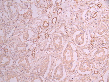 • IHC image of CSB-RA163563A0HU diluted at 1:100 and staining in paraffin-embedded human kidney tissue performed on a Leica BondTM system. After dewaxing and hydration, antigen retrieval was mediated by high pressure in a citrate buffer (pH 6.0). Section was blocked with 10% normal goat serum 30min at RT. Then primary antibody (1% BSA) was incubated at 4°C overnight. The primary is detected by a Goat anti-rabbit polymer IgG labeled by HRP and visualized using 0.05% DAB.