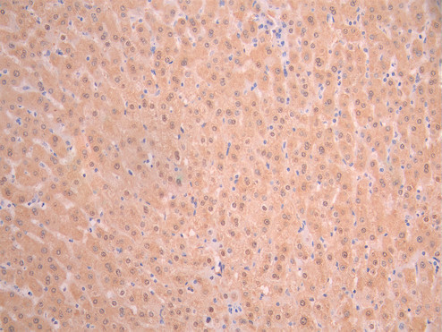 IHC image of CSB-RA234270A0HU diluted at 1:100 and staining in paraffin-embedded human liver tissue performed on a Leica BondTM system. After dewaxing and hydration, antigen retrieval was mediated by high pressure in a citrate buffer (pH 6.0). Section was blocked with 10% normal goat serum 30min at RT. Then primary antibody (1% BSA) was incubated at 4°C overnight. The primary is detected by a Goat anti-rabbit polymer IgG labeled by HRP and visualized using 0.05% DAB.