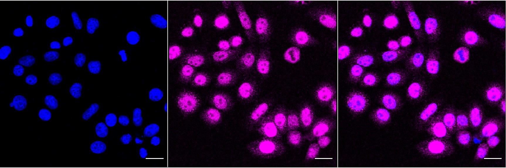 Immunocytochemical staining of HepG2 cells with Aryl hydrocarbon receptor antibody. Nuclei were stained blue with DAPI; Aryl hydrocarbon receptor was stained magenta with Alexa Fluor? 647. Images were taken using Leica stellaris 5. Protein abundance based on laser Intensity and smart gain: Medium. Scale bar, 20 μm.