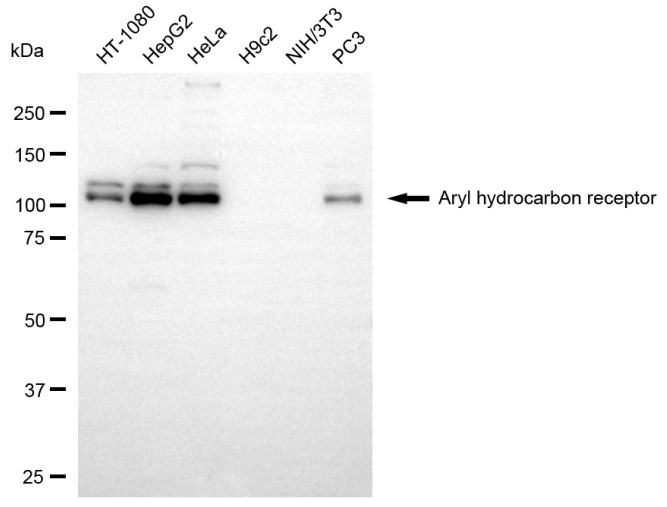 Western blotting analysis using aryl hydrocarbon receptor antibody. Total cell lysates (30 μg) from various cell lines were loaded and separated by SDS-PAGE. The blot was incubated with aryl hydrocarbon receptor antibody and HRP-conjugated goat anti-rabbit secondary antibody respectively.