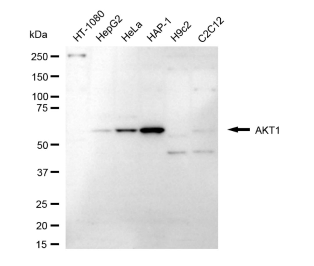 • Western blotting analysis using AKT1 antibody. Total cell lysates (30 μg) from various cell lines were loaded and separated by SDS-PAGE. The blot was incubated with AKT1 antibody and HRP-conjugated goat anti-rabbit secondary antibody respectively.