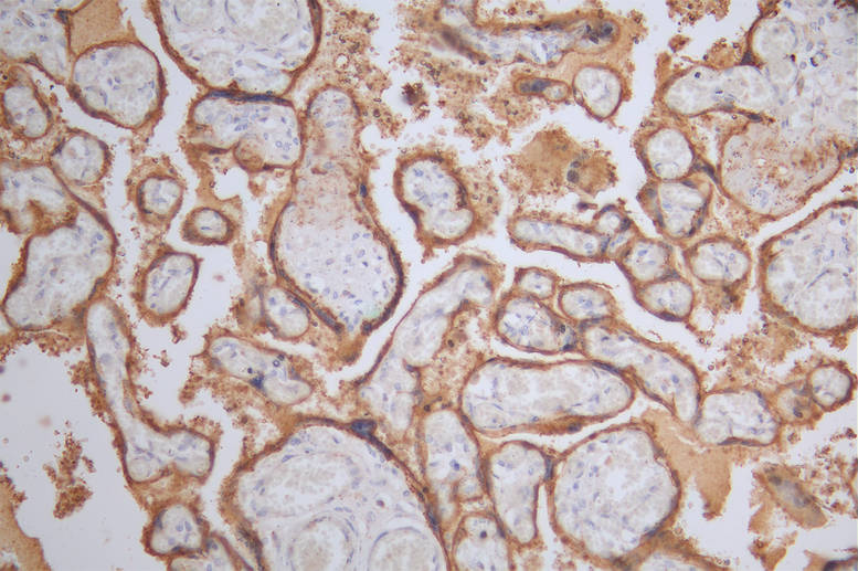 • IHC image of CSB-RA183247A0HU diluted at 1:50 and staining in paraffin-embedded human placenta tissue performed on a Leica BondTM system. After dewaxing and hydration, antigen retrieval was mediated by high pressure in a citrate buffer (pH 6.0). Section was blocked with 10% normal goat serum 30min at RT. Then primary antibody (1% BSA) was incubated at 4°C overnight. The primary is detected by a Goat anti-rabbit polymer IgG labeled by HRP and visualized using 0.39% DAB.