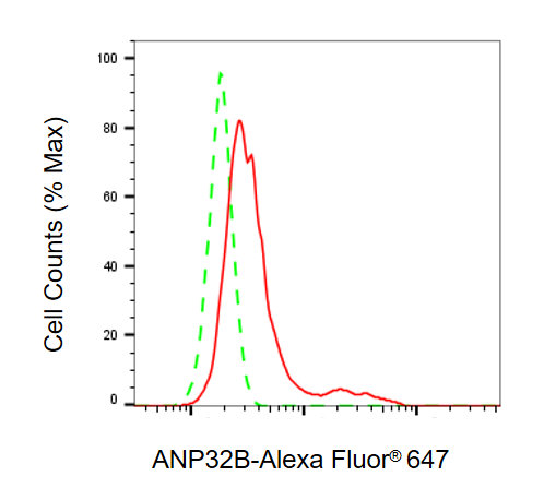 Flow cytometric analysis of ANP32B expression in HepG2 cells using ANP32B antibody. Green, isotype control; red, ANP32B.