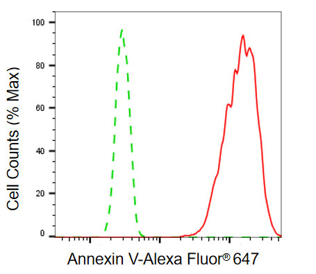 • Flow cytometric analysis of annexin V expression in HT-1080 cells using annexin V antibody. Green, isotype control; red, annexin V.