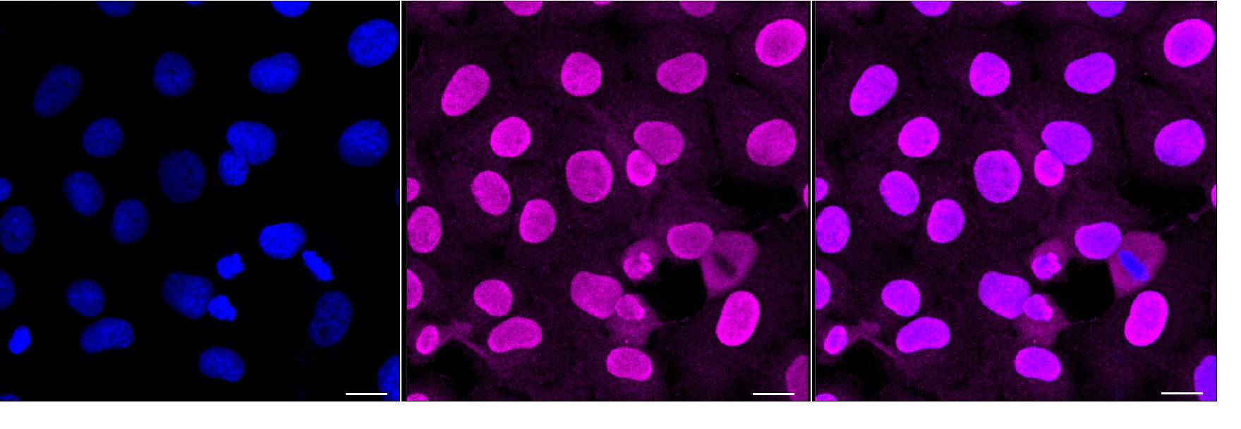 • Immunocytochemical staining of HT-1080 cells with ANXA5 antibody. Nuclei were stained blue with DAPI; ANXA5 was stained magenta with Alexa Fluor? 647. Images were taken using Leica stellaris 5. Protein abundance based on laser Intensity and smart gain: High. Scale bar, 20 μm.