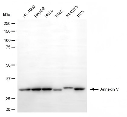 • Western blotting analysis using annexin V antibody. Total cell lysates (30 μg) from various cell lines were loaded and separated by SDS-PAGE. The blot was incubated with annexin V antibody and HRP-conjugated goat anti-rabbit secondary antibody respectively.