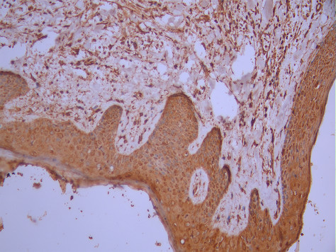 • IHC image of CSB-RA699080A0HU diluted at 1:100 and staining in paraffin-embedded human skin tissue performed on a Leica BondTM system. After dewaxing and hydration, antigen retrieval was mediated by high pressure in a citrate buffer (pH 6.0). Section was blocked with 10% normal goat serum 30min at RT. Then primary antibody (1% BSA) was incubated at 4°C overnight. The primary is detected by a Goat anti-rabbit polymer IgG labeled by HRP and visualized using 0.05% DAB.
