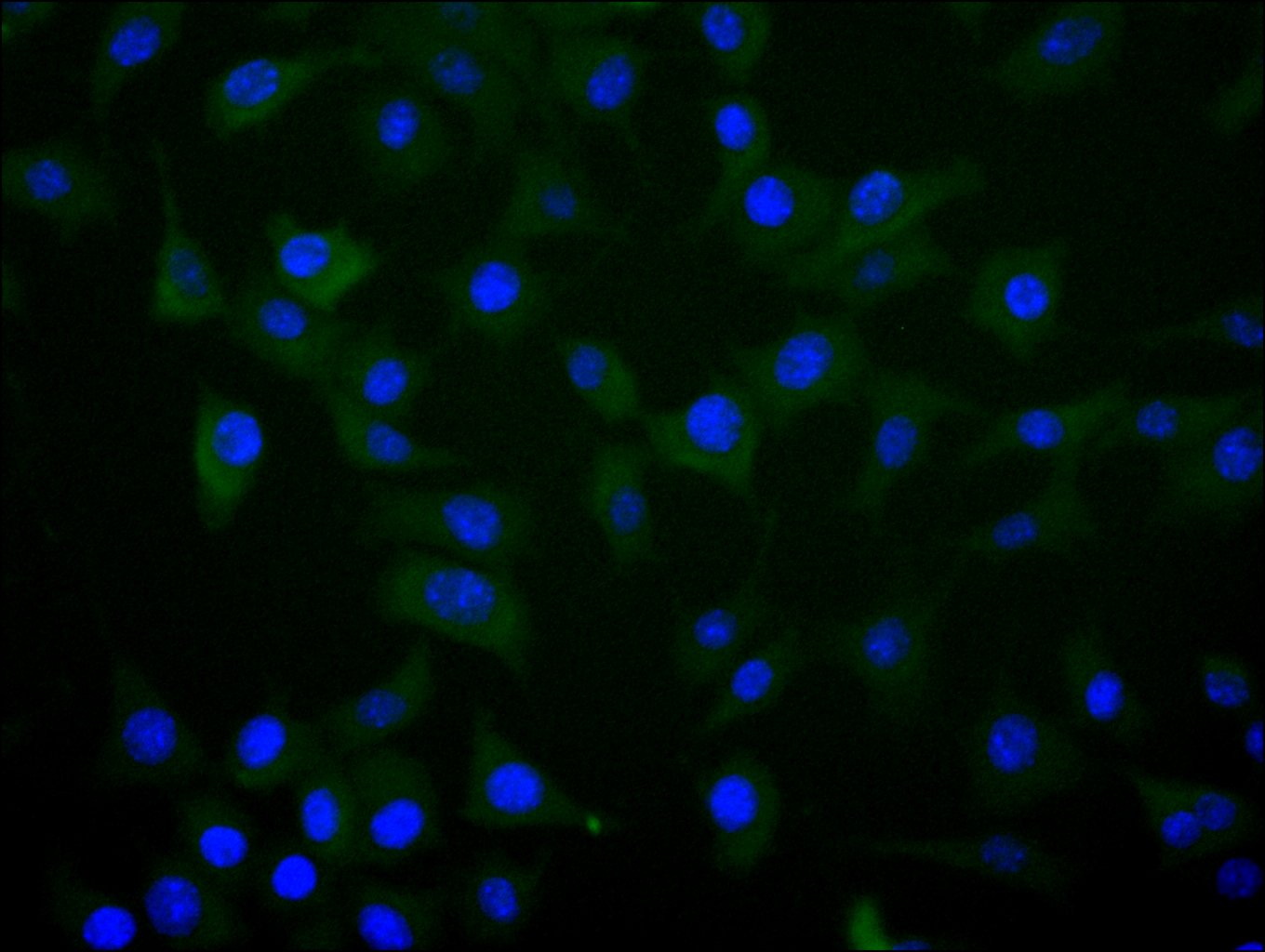 • Immunofluorescence staining of SH-SY5Y cell with CSB-RA001950MA2HU at 1:20, counter-stained with DAPI. The cells were fixed in 4% formaldehyde and blocked in 10% normal Goat Serum. The cells were then incubated with the antibody overnight at 4C. The secondary antibody was FITC-conjugated AffiniPure Goat Anti-Human IgG(H+L).