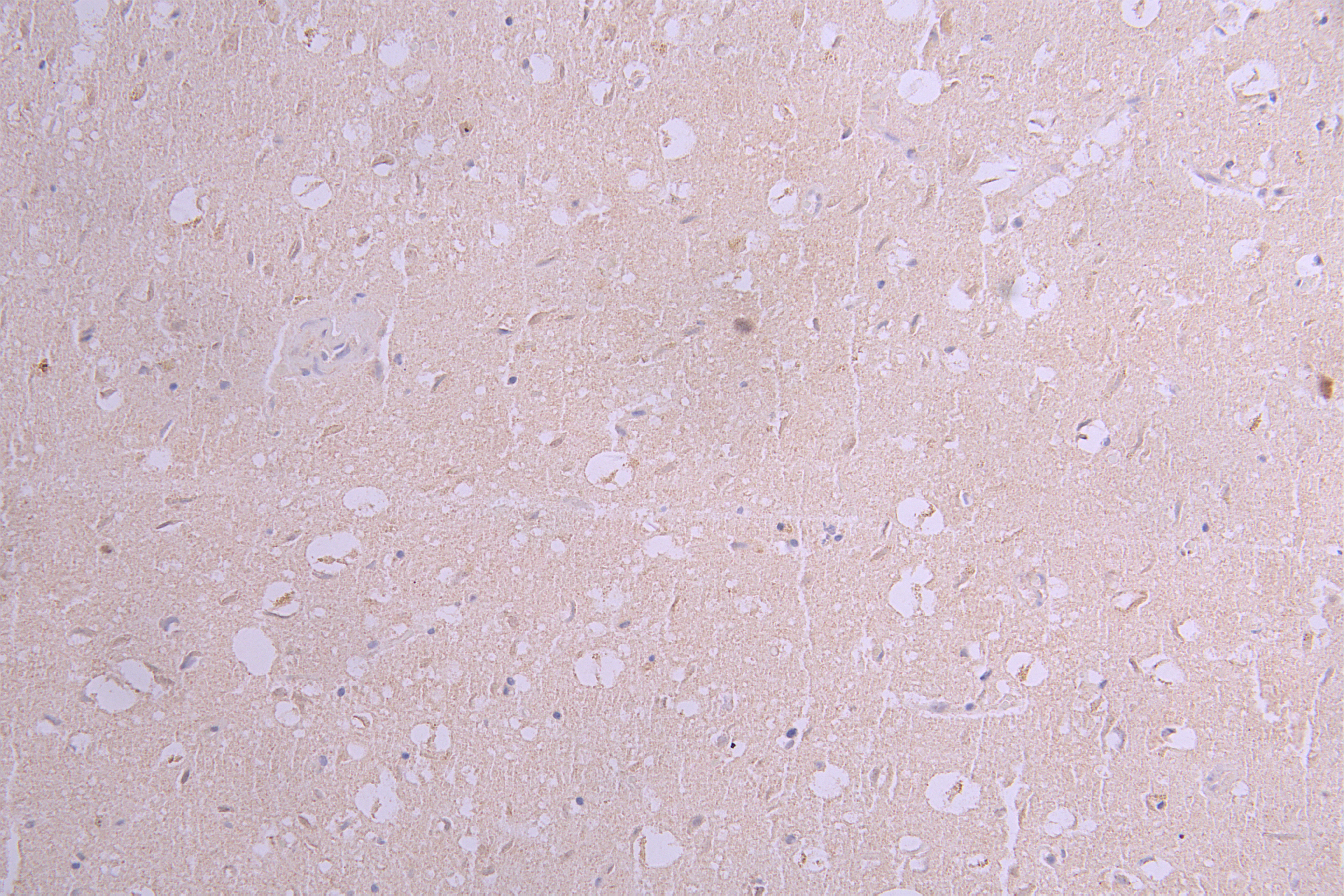 • IHC image of CSB-RA001950MA2HU diluted at 1:50 and staining in paraffin-embedded human brain tissue performed on a Leica BondTM system. After dewaxing and hydration, antigen retrieval was mediated by high pressure in a citrate buffer (pH 6.0). Section was blocked with 10% normal goat serum 30min at RT. Then primary antibody (1% BSA) was incubated at 4°C overnight. The primary is detected by a Goat anti-human polymer IgG labeled by HRP and visualized using 0.05% DAB.