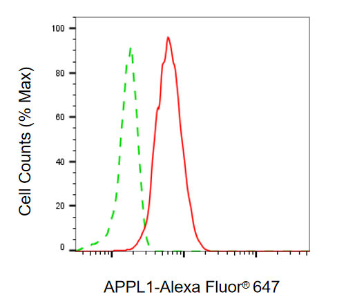 Flow cytometric analysis of APPL1 expression in HepG2 cells using APPL1 antibody. Green, isotype control; red, APPL1.