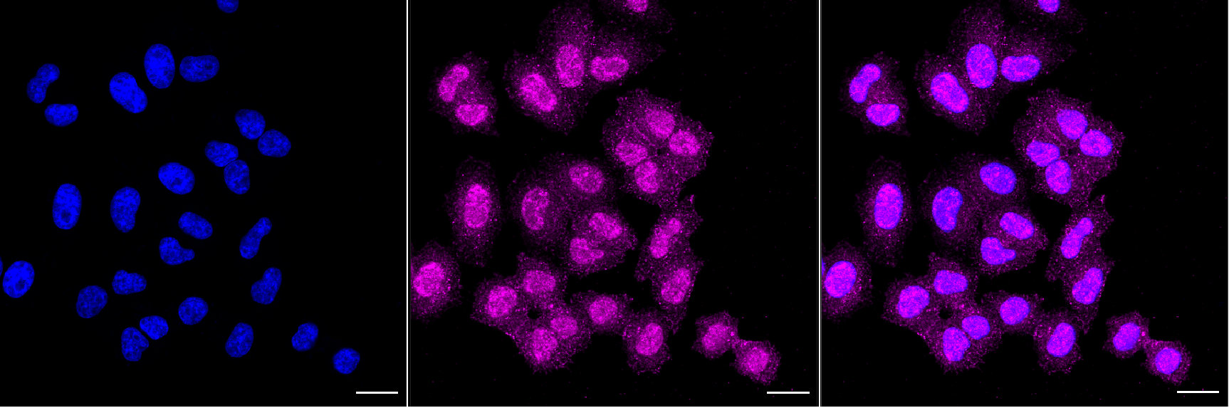 Immunocytochemical staining of HepG2 cells with APPL1 antibody. Nuclei were stained blue with DAPI; APPL1 was stained magenta with Alexa Fluor? 647. Images were taken using Leica stellaris 5. Protein abundance based on laser Intensity and smart gain: High. Scale bar, 20 μm.