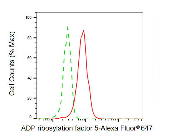 Flow cytometric analysis of ADP ribosylation factor 5 expression in HepG2 cells using ADP ribosylation factor 5 antibody. Green, isotype control; red, ADP ribosylation factor 5.