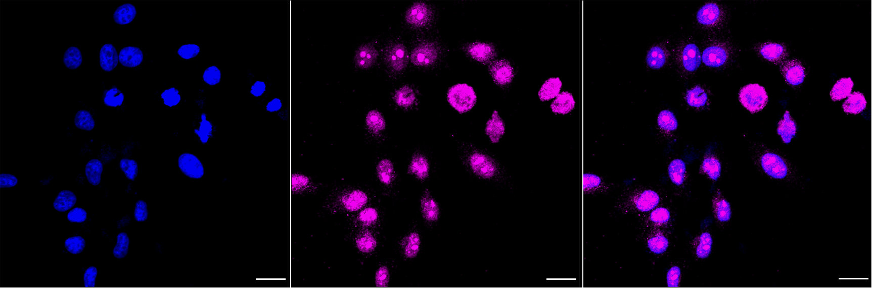 Immunocytochemical staining of HepG2 cells with ADP ribosylation factor 5 antibody. Nuclei were stained blue with DAPI; ADP ribosylation factor 5 was stained magenta with Alexa Fluor? 647. Images were taken using Leica stellaris 5. Protein abundance based on laser Intensity and smart gain: Medium. Scale bar, 20 μm.