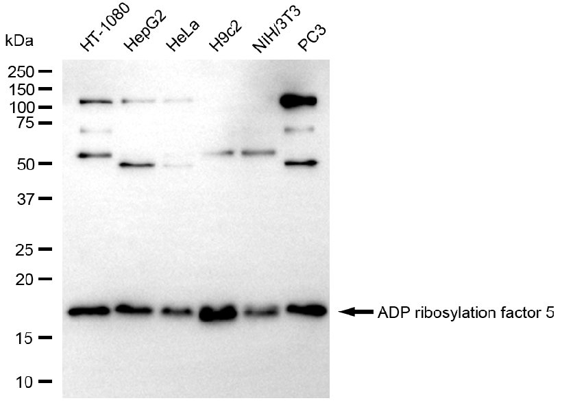 Western blotting analysis using ADP ribosylation factor 5 antibody. Total cell lysates (30 μg) from various cell lines were loaded and separated by SDS-PAGE. The blot was incubated with ADP ribosylation factor 5 antibody and HRP-conjugated goat anti-rabbit secondary antibody respectively.