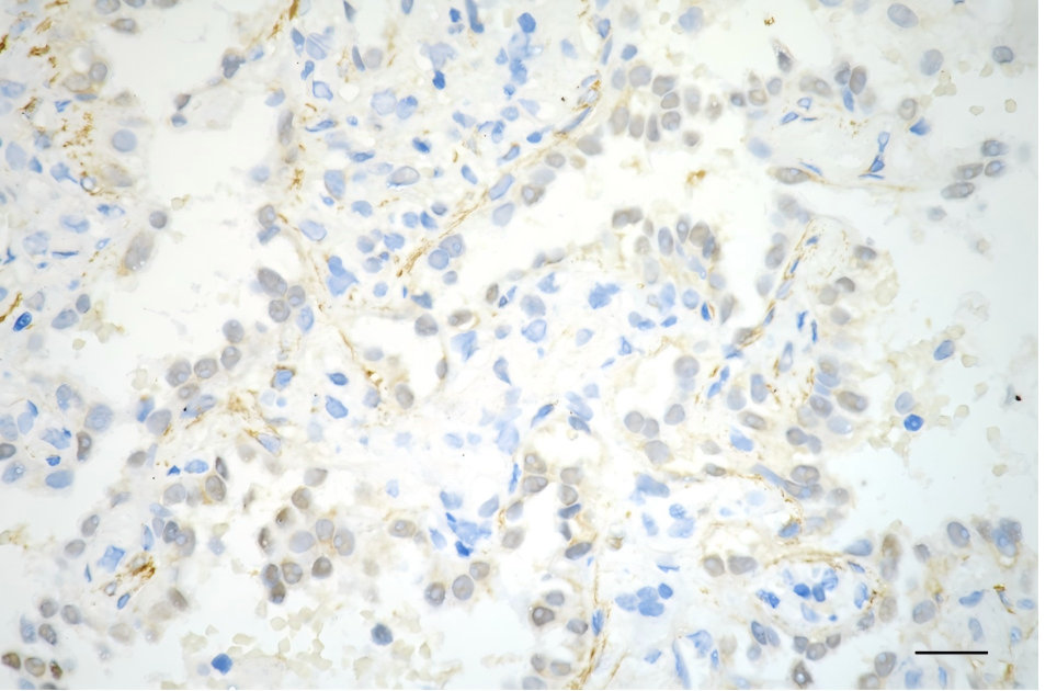 Immunohistochemistry was performed on paraffin-embedded human lung adenocarcinoma using phospho-beta arrestin 1 (S412) antibody. Antigen retrieval was done in sodium citrate buffer (pH 6.0). DAB was used for detection, with hematoxylin counterstaining. Images were acquired using a Nikon Ci-L Plus microscope (40× objective). Scale bar: 25 μm.