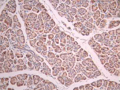 IHC image of CSB-RA576831A0HU diluted at 1:100 and staining in paraffin-embedded human pancreatic tissue performed on a Leica BondTM system. After dewaxing and hydration, antigen retrieval was mediated by high pressure in a citrate buffer (pH 6.0). Section was blocked with 10% normal goat serum 30min at RT. Then primary antibody (1% BSA) was incubated at 4°C overnight. The primary is detected by a Goat anti-rabbit polymer IgG labeled by HRP and visualized using 0.05% DAB.