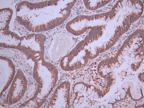 IHC image of CSB-RA576831A0HU diluted at 1:100 and staining in paraffin-embedded human gastric cancer performed on a Leica BondTM system. After dewaxing and hydration, antigen retrieval was mediated by high pressure in a citrate buffer (pH 6.0). Section was blocked with 10% normal goat serum 30min at RT. Then primary antibody (1% BSA) was incubated at 4°C overnight. The primary is detected by a Goat anti-rabbit polymer IgG labeled by HRP and visualized using 0.05% DAB.
