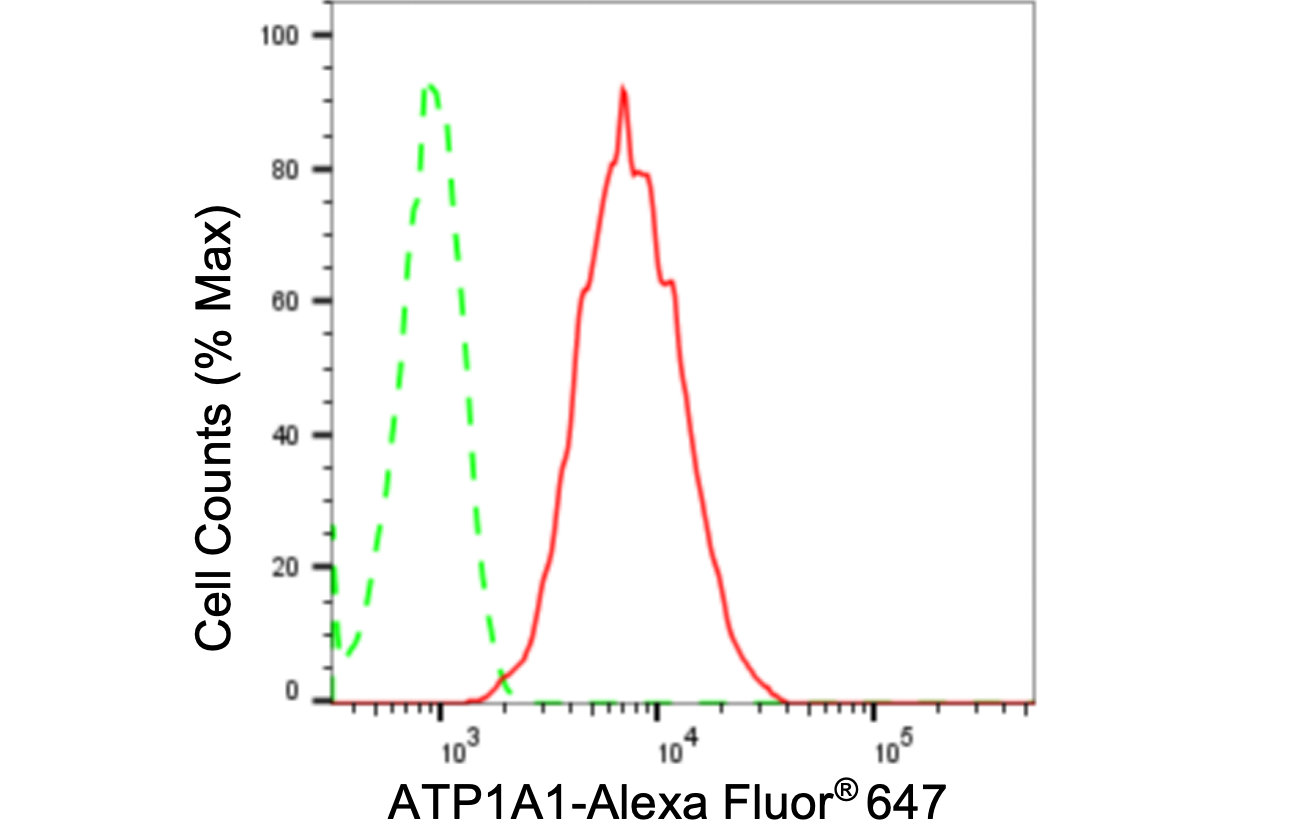 • Flow cytometric analysis of ATP1A1 expression in HepG2 cells using ATP1A1 antibody. Green, isotype control; red, ATP1A1.