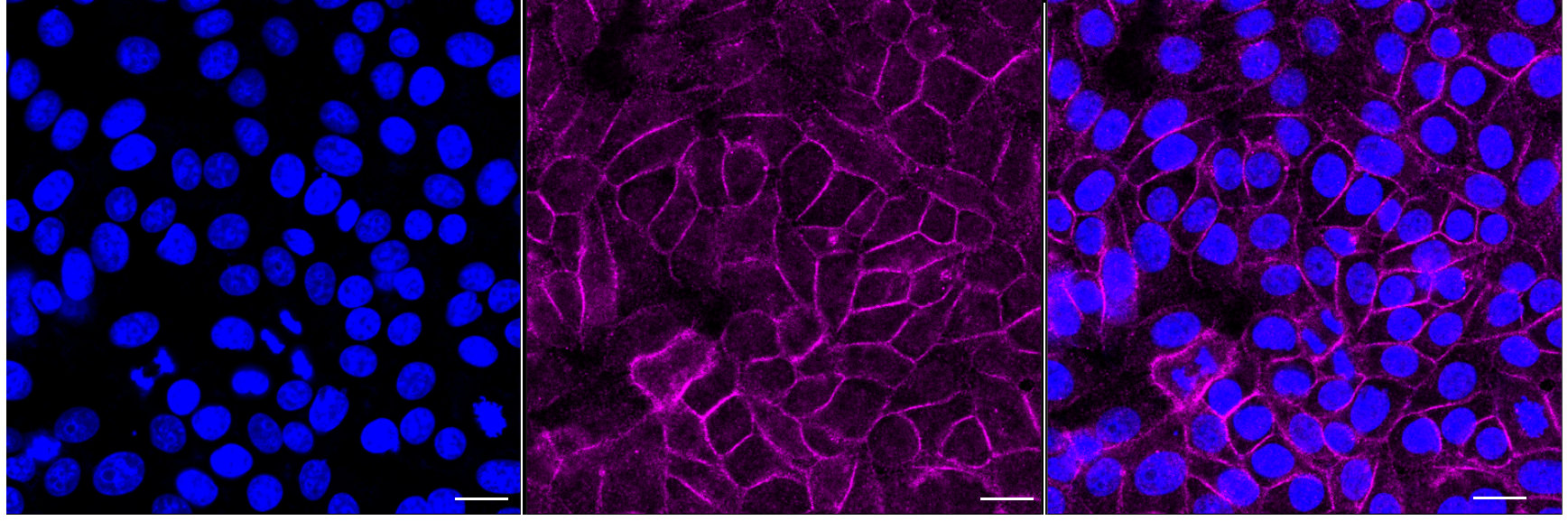 • Immunocytochemical staining of HepG2 cells with ATP1A1 antibody. Nuclei were stained blue with DAPI; ATP1A1 was stained magenta with Alexa Fluor? 647. Images were taken using Leica stellaris 5. Protein abundance based on laser Intensity and smart gain: Meduim. Scale bar: 20 μm.