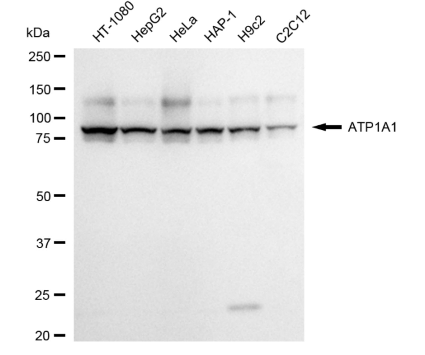 • Western blotting analysis using ATP1A1 antibody. Total cell lysates (30 μg) from various cell lines were loaded and separated by SDS-PAGE. The blot was incubated with ATP1A1 antibody and HRP-conjugated goat anti-rabbit secondary antibody respectively.