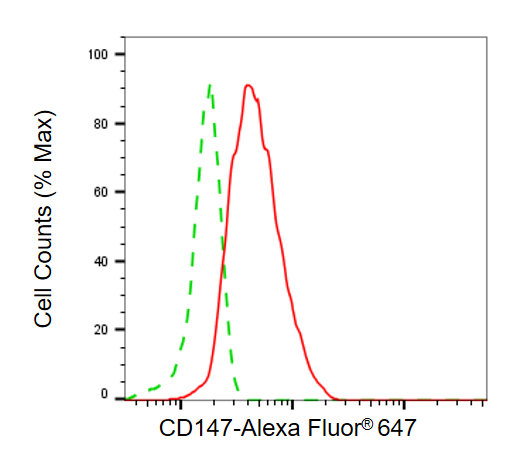 • Flow cytometric analysis of CD147 expression in HepG2 cells using CD147 antibody. Green, isotype control; red, CD147.
