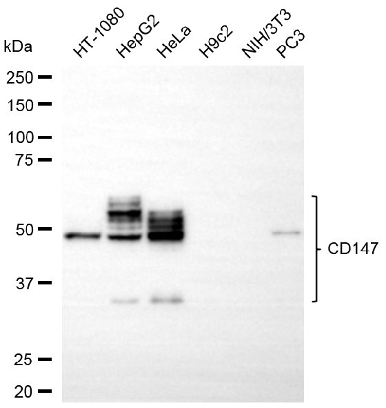 • Western blotting analysis using CD147 antibody. Total cell lysates (30 μg) from various cell lines were loaded and separated by SDS-PAGE. The blot was incubated with CD147 antibody and HRP-conjugated goat anti-rabbit secondary antibody respectively.