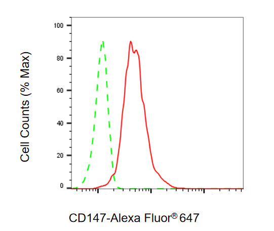 Flow cytometric analysis of CD147 expression in HepG2 cells using CD147 antibody. Green, isotype control; red, CD147.