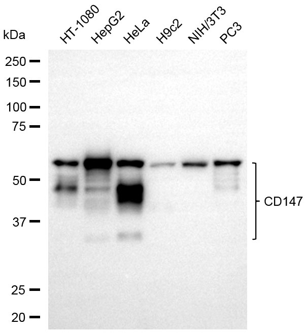 Western blotting analysis using CD147 antibody. Total cell lysates (30 μg) from various cell lines were loaded and separated by SDS-PAGE. The blot was incubated with CD147 antibody and HRP-conjugated goat anti-rabbit secondary antibody respectively.