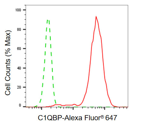 Flow cytometric analysis of C1QBP expression in HepG2 cells using C1QBP antibody. Green, isotype control; red, C1QBP.
