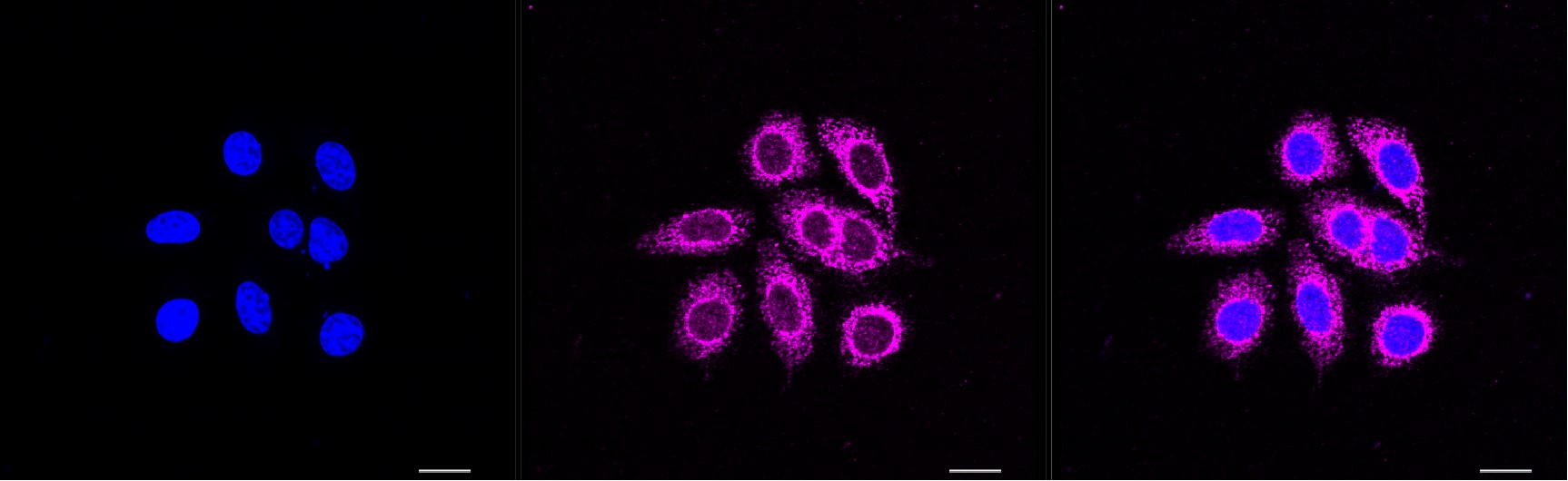Immunocytochemical staining of HepG2 cells with C1QBP antibody. Nuclei were stained blue with DAPI; C1QBP was stained magenta with Alexa Fluor? 647. Images were taken using Leica stellaris 5. Protein abundance based on laser Intensity and smart gain: Medium. Scale bar, 20 μm.