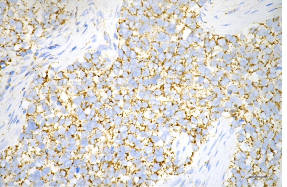 Immunohistochemistry was performed on paraffin-embedded human breast carcinoma using C1QBP antibody. Antigen retrieval was done in sodium citrate buffer (pH 6.0). DAB was used for detection, with hematoxylin counterstaining. Images were acquired using a Nikon Ci-L Plus microscope (40× objective). Scale bar: 25 μm.