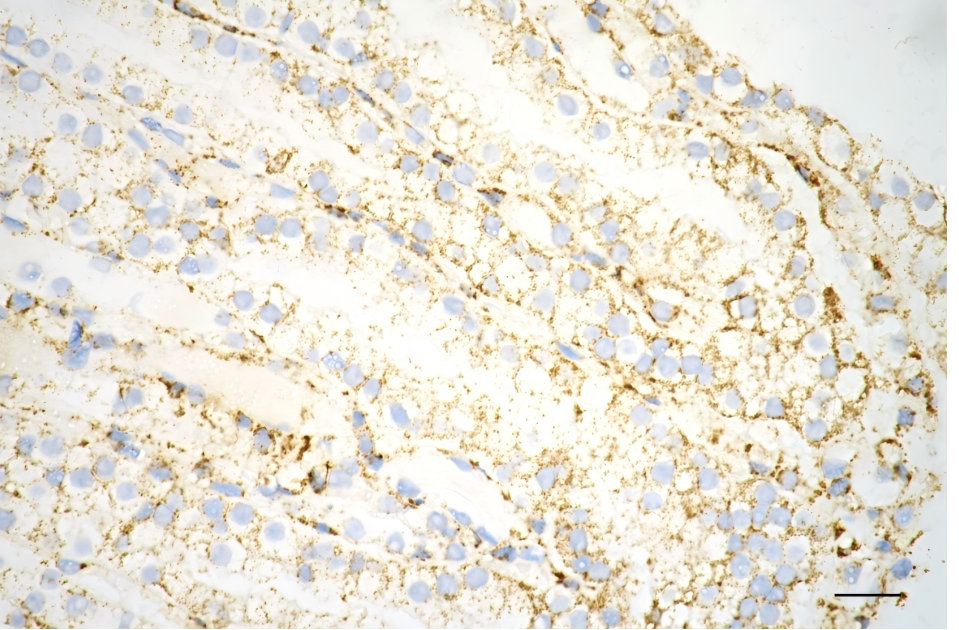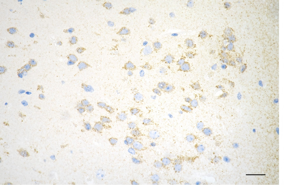 Immunohistochemistry was performed on paraffin-embedded mouse brain using C1QBP antibody. Antigen retrieval was done in sodium citrate buffer (pH 6.0). DAB was used for detection, with hematoxylin counterstaining. Images were acquired using a Nikon Ci-L Plus microscope (40× objective). Scale bar: 25 μm.