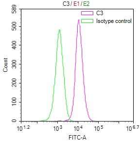 • Overlay Peak curve showing HepG2 cells stained with CSB-RA355590MA1HU (red line) at 1:100. The cells were fixed in 4% formaldehyde and permeated by 0.2% TritonX-100 for 10min. Then 10% normal goat serum to block non-specific protein-protein interactions followed by the antibody (1ug/1*106cells) for 45min at 4℃. The secondary antibody used was Fluorescein (FITC) AffiniPure Goat Anti-Human IgG, Fcγ fragment specific at 1:200 dilution for 35min at 4℃.Control antibody (green line) was human IgG1 (1ug/1*106cells) used under the same conditions. Acquisition of >10,000 events was performed.
