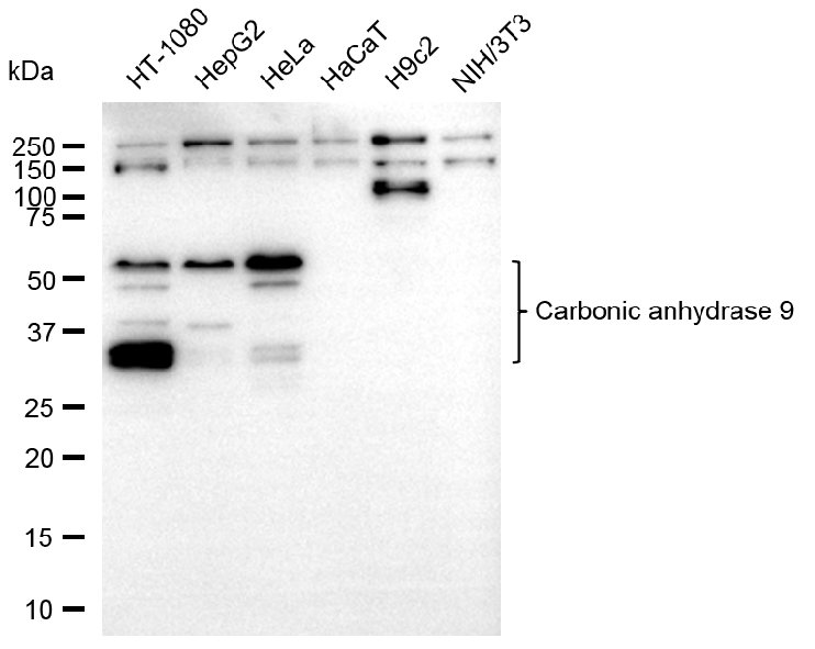 Western blotting analysis using carbonic anhydrase 9 antibody. Total cell lysates (30 μg) from various cell lines were loaded and separated by SDS-PAGE. The blot was incubated with carbonic anhydrase 9 antibody and HRP-conjugated goat anti-rabbit secondary antibody respectively.