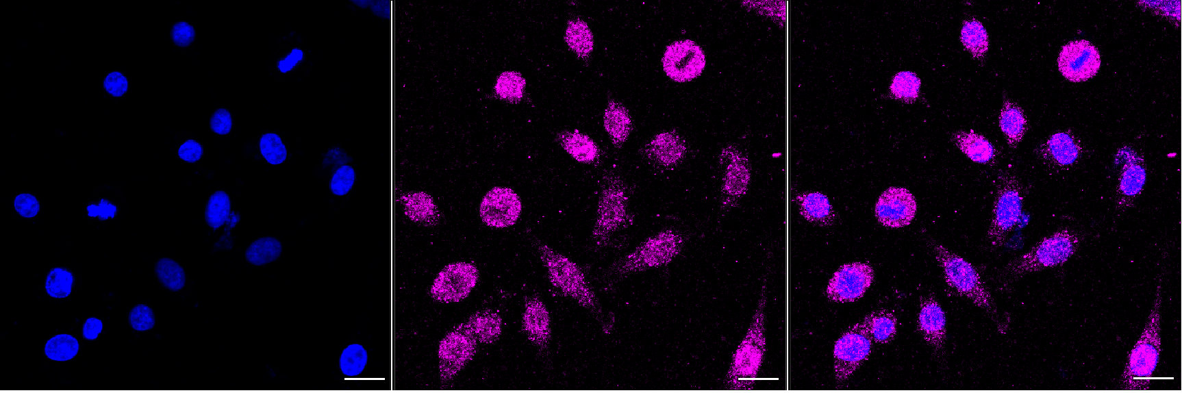 Immunocytochemical staining of HepG2 cells with Caspase 8 antibody. Nuclei were stained blue with DAPI; Caspase 8 was stained magenta with Alexa Fluor? 647. Images were taken using Leica stellaris 5. Protein abundance based on laser Intensity and smart gain: Medium. Scale bar, 20 μm.