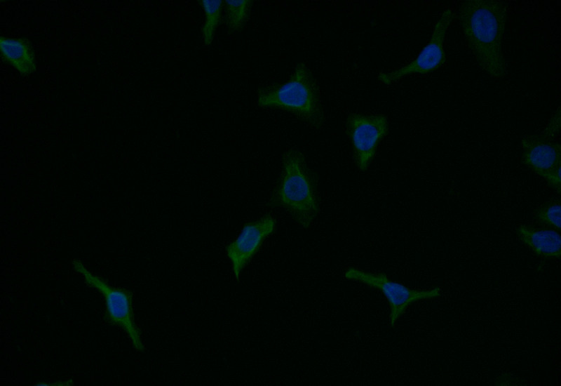 • Immunofluorescence staining of HepG2 with CSB-RA940979A0HU at 1:7, counter-stained with DAPI. The cells were fixed in 4% formaldehyde and blocked in 10% normal Goat Serum. The cells were then incubated with the antibody overnight at 4°C. The secondary antibody was Alexa Fluor 525-congugated AffiniPure Goat Anti-Rabbit IgG(H+L).