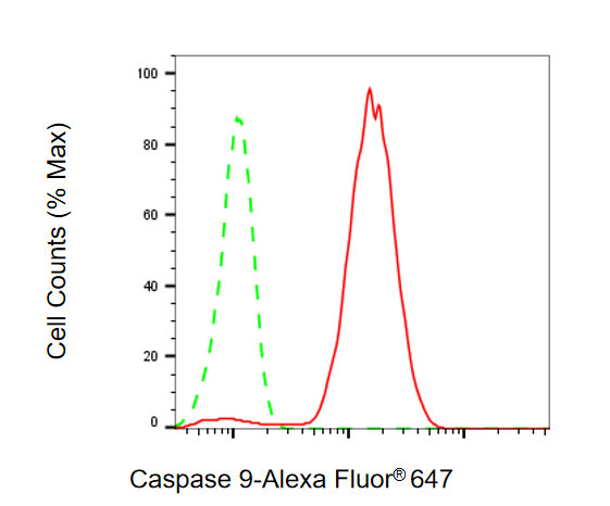 Flow cytometric analysis of Caspase 9 expression in HepG2 cells using Caspase 9 antibody. Green, isotype control; red, Caspase 9.
