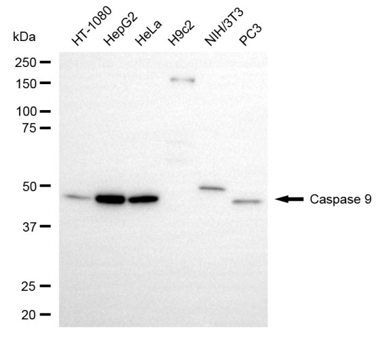 Western blotting analysis using caspase 9 antibody. Total cell lysates (30 μg) from various cell lines were loaded and separated by SDS-PAGE. The blot was incubated with caspase 9 antibody and HRP-conjugated goat anti-rabbit secondary antibody respectively.