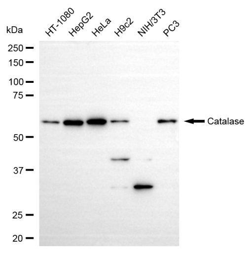 • Western blotting analysis using catalase antibody. Total cell lysates (30 μg) from various cell lines were loaded and separated by SDS-PAGE. The blot was incubated with catalase antibody and HRP-conjugated goat anti-rabbit secondary antibody respectively.