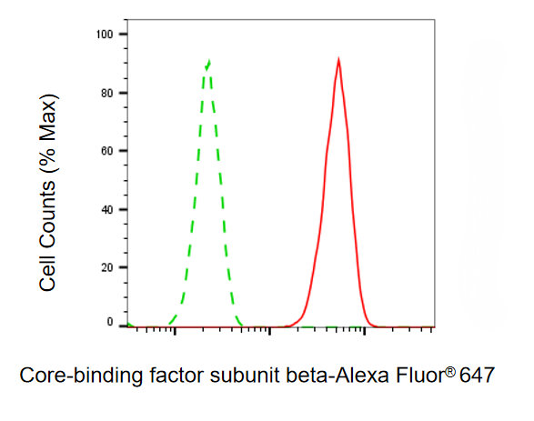 Flow cytometric analysis of Core-binding factor subunit beta expression in HAP-1 cells using Core-binding factor subunit beta antibody. Green, isotype control; red, Core-binding factor subunit beta.