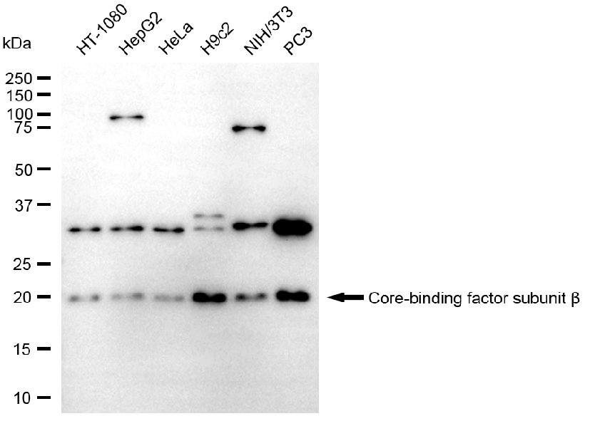 Western blotting analysis using core-binding factor subunit beta antibody. Total cell lysates (30 μg) from various cell lines were loaded and separated by SDS-PAGE. The blot was incubated with core-binding factor subunit beta antibody and HRP-conjugated goat anti-rabbit secondary antibody respectively.