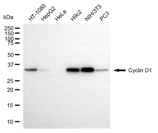 Western blotting analysis using cyclin D1 antibody. Total cell lysates (30 μg) from various cell lines were loaded and separated by SDS-PAGE. The blot was incubated with cyclin D1 antibody and HRP-conjugated goat anti-rabbit secondary antibody respectively.