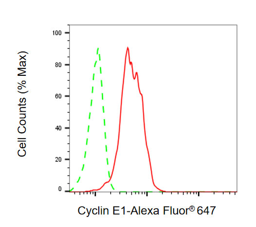 Flow cytometric analysis of Cyclin E1 expression in HeLa cells using Cyclin E1 antibody. Green, isotype control; red, Cyclin E1.