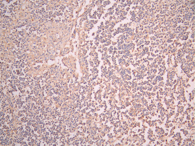IHC image of CSB-RA004839MA1HU diluted at 1:50 and staining in paraffin-embedded human lymph node tissue performed on a Leica BondTM system. After dewaxing and hydration, antigen retrieval was mediated by high pressure in a citrate buffer (pH 6.0). Section was blocked with 10% normal goat serum 30min at RT. Then primary antibody (1% BSA) was incubated at 4°C overnight. The primary is detected by a Anti-Human lgG, Fcy Fragment Specific labeled by HRP and visualized using 0.05% DAB.